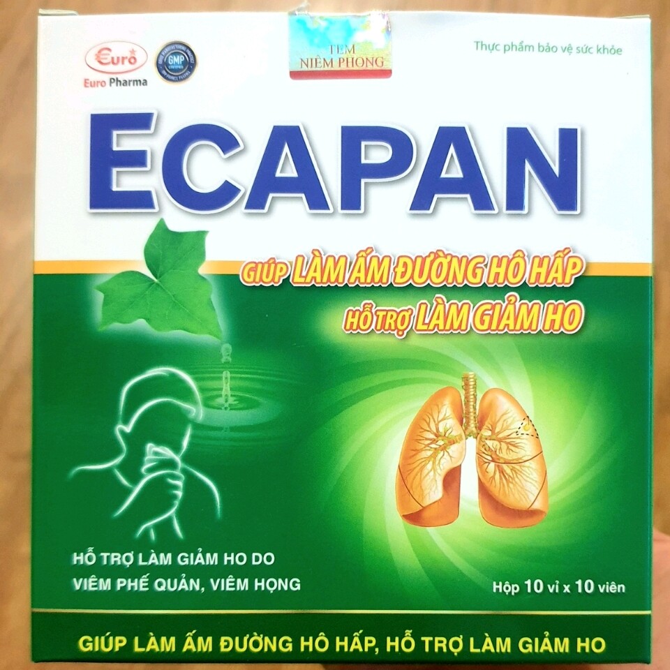 🍁 ECAPAN - Viên uống Giảm ho, bổ phế, giúp làm ấm đường hô hấp trên rất hiệu quả (những người sau COVID có tổn thương đường hô hấp có thể dùng viên uống ECAPAN để làm ấm đường hô hấp, giảm ho, hỗ trợ các triệu chứng của đường hô hấp trên và dưới). ☘Thành phần: mỗi viên chứa: -Eucalyptol 100mg -Cao cma thảo 50mg - Cao khô lá thường xuân 20mg - Tinh dầu gừng 0,75mg - Menthol 0,5mg - Tinh dầu tần 0,15mg - Phụ liệu: vỏ nang gelatin, glycerin, chất làm dầy, dầu cọ, sáp ong... ☘Công dụng: - Giúp làm ấm đường hô hấp - Hỗ trợ làm giảm ho do viêm phế quản, viêm họng, ho do cảm lạnh, ho gió, ho khan, ho do thay đổi thời tiết, ngứa rát họng, khản tiếng. ☘Cách dùng: -Trẻ em trên 3 tuổi: 1 viên/lần x 2,3 lần/ngày - Người lớn: 2 viên/lần x 2,3 lần/ngày ☘Thương nhân chịu trách nhiệm sản phẩm: Công ty CP đầu tư kinh doanh Dược phẩm Châu Âu Sản xuất: Công ty cổ phần liên doanh Dược phẩm TPP - France 🍀 Số ĐKBCB 4975/2019/ĐKSP 🍀 Quy cách: hộp 10 vỉ x 10 viên ☘HSD: 15/09/2024 💰 Giá bán: 85.000 vnđ