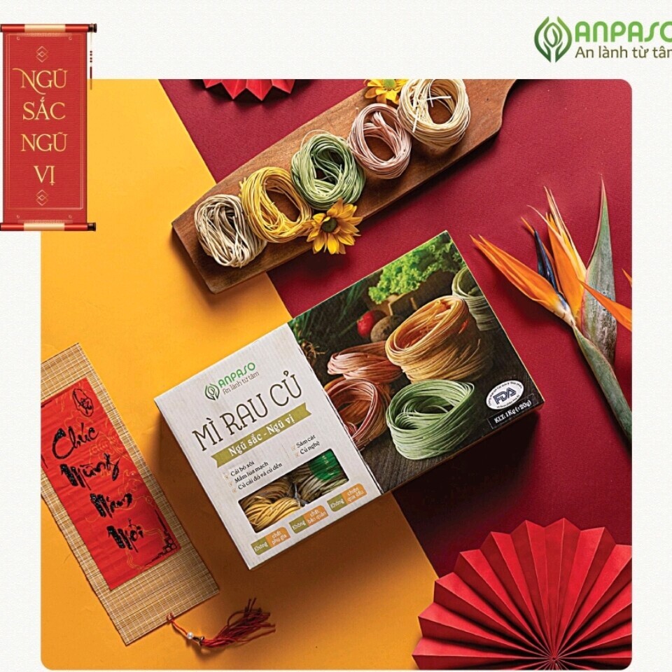 Quy cách: Gồm 5 vị mì rau củ ngũ sắc ngũ vị truyền thống của Anpaso: cải bó xôi, mầm lúa mạch, sâm cát, nghệ, củ cải đỏ và củ dền