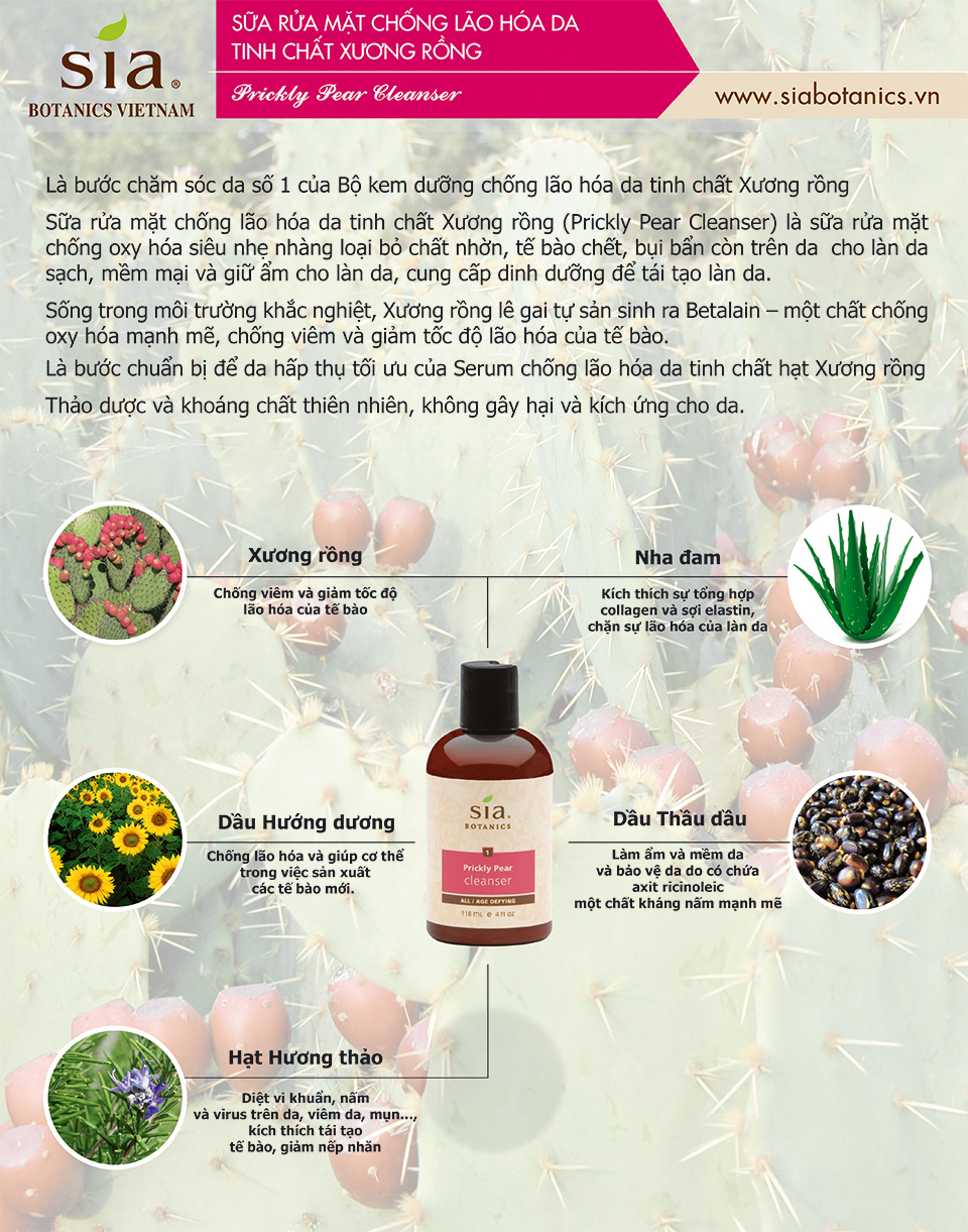 Sia Botanics Prickly Pear Cleanser là một loại sữa rửa mặt chống oxy hóa siêu nhẹ nhàng cho làn da sạch, mềm mại da luôn được cân bằng và ngậm nước giữ ẩm cho làn da thêm khỏe khoắn và tươi tắn mỗi ngày.